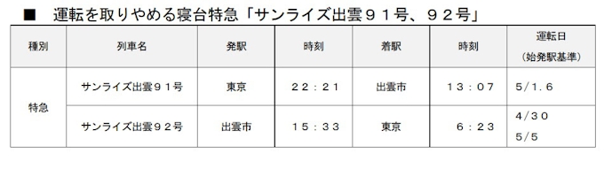 Jr東日本 寝台特急 サンライズ出雲91号 92号 の運休について発表 日本経済新聞